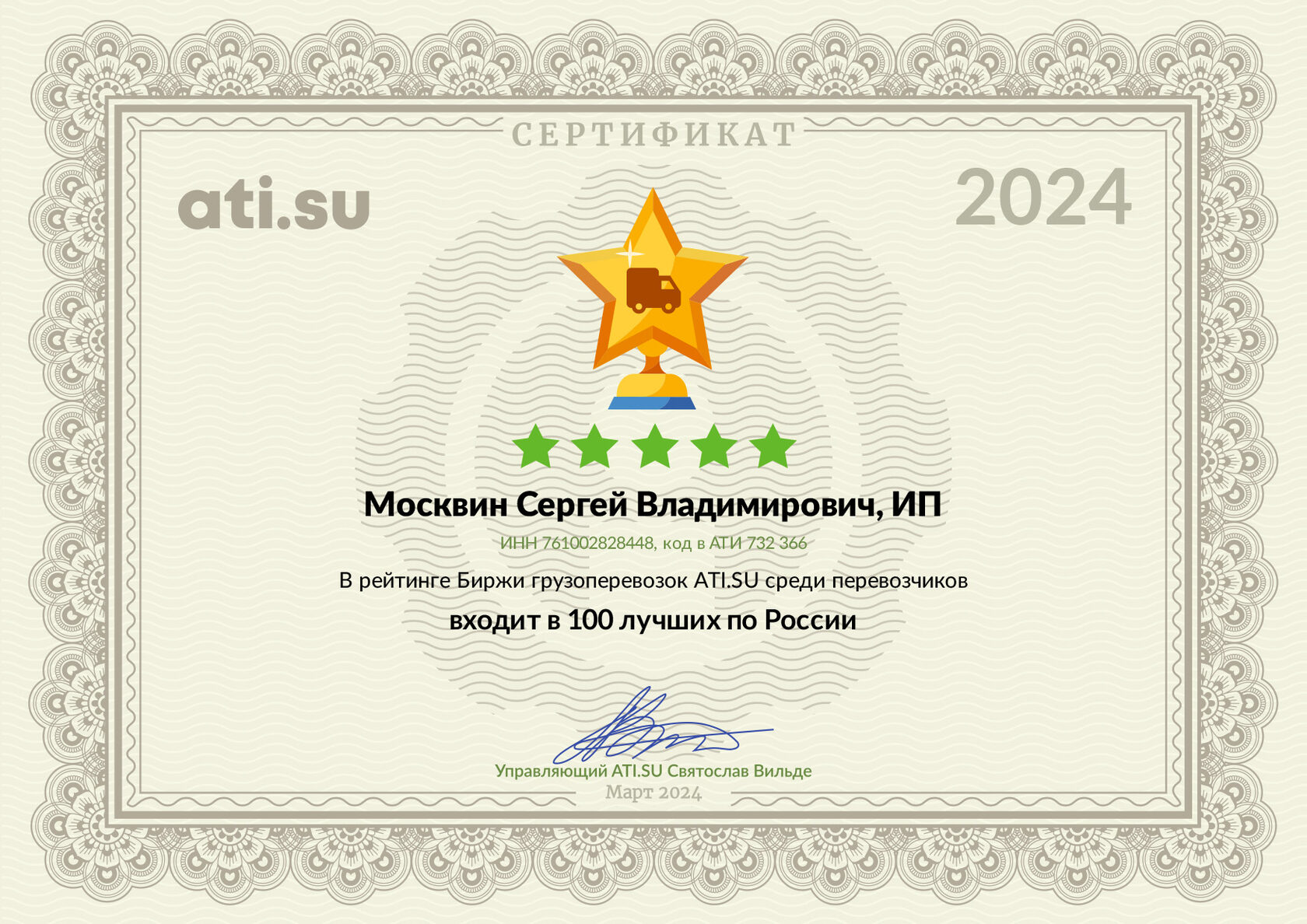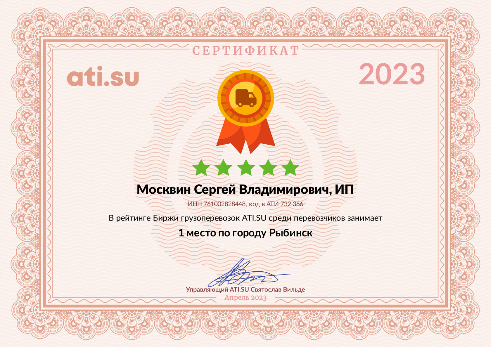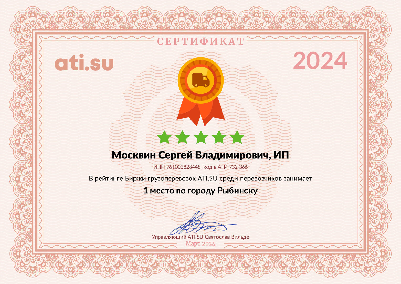 ТОП 3 перевозчиков города Рыбинска по рейтингу АТИ,а также в ТОП 100 лучших перевозчиков страны по рейтингу АТИ из 60974